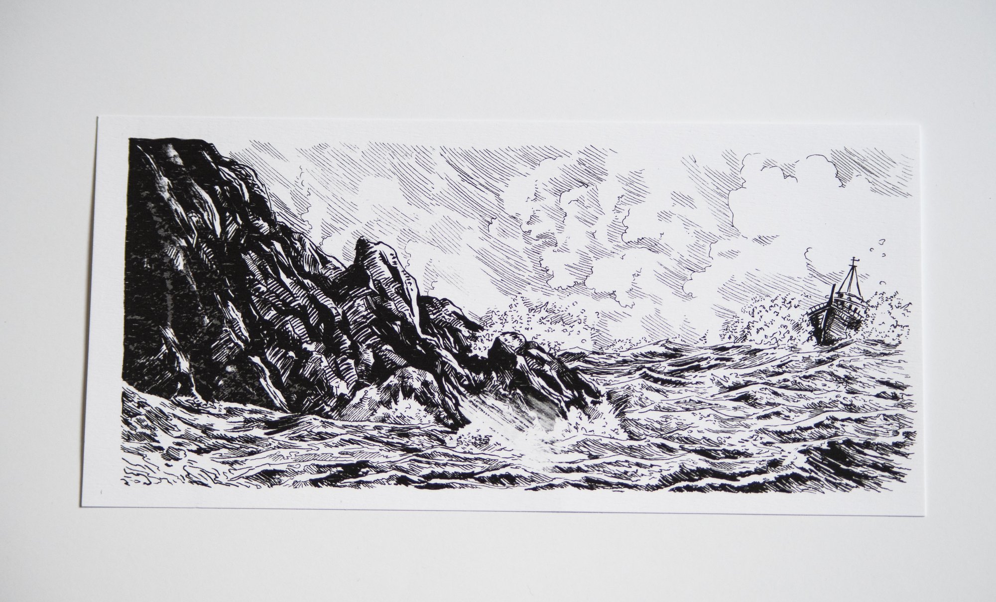illustration aux feutres fins et à l'encre de chine, tirage sur papier naturel blanc texturé 320 g, format 26x12,5 cm